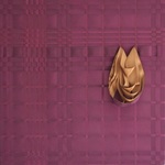 2010Donkerpaars vlechtwerk gespannen op een houten frame waarvan een strook losgehaald is en gevuld is met goudbruin satijnlint.