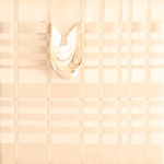 2015Gevlochten satijnlint in champagne kleur dat gespannen is op een houten frame van 40 x 40 cm met een druppel gevuld met lint in verschillende lichte kleurschakeringen.