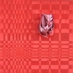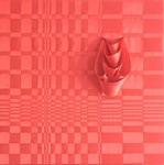 2022Warm rood satijnlint dat gevlochten/ geweven en gespannen is op een houten frame van 75 x 75 cm. Een lint is losgetrokken in een druppelvorm en gevuld d.m.v. moulage met lint in drie tinten donkerroze als een bloeiende roos. Het werk heeft geen lijst nodig, het is afgewerkt aan de zijkant met een lint en aan de achterkant kan het opgehangen worden op het frame, aan een ophanghaak of aan het ijzerdraad dat er over de breedte gespannen is.
