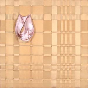 2011Huidskleur vlechtwerk gemaakt van satijnlint gespannen op een houten frame. In de traandruppel zit gebroken wit lint.